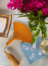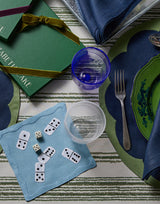Our domino cocktail napkins are back for holiday! This set of four is crafted on a medium-weight linen and features dominos hand-stitched in appliqué and embroidery. The perfect gift for game night lovers.