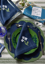 Introducing our Jasmine napkins in a classic new palette. This set of two is crafted on a medium weight navy linen with florals hand-stitched in appliqué and embroidery. For a matching look pair with our Porto Placemats.