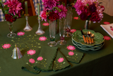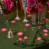 The Marguerite tablecloth is back for holiday in a rich green Belgian linen! Inspired by our love for 19th century American quilts, the Marguerite is finished with hand-embroidered scalloped borders in pink and florals in our signature appliqué. Pair with our matching Marguerite dinner napkins.