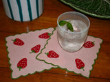 Our Strawberries in pink are back! With hand-embroidered borders and berries carefully stitched in appliqué, this set of four is the perfect addition to your spring-summer gatherings.