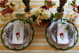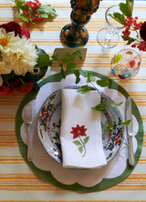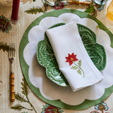 We love a classic Poinsettia for your holiday tables and beyond. This set is crafted on a crisp white linen and features appliqué florals in a red-orange linen with marigold hand-embroidery. Pair with our Porto placemats.