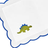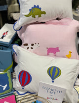 Elizabeth Lake for Littles is here! Shop our new boudoir pillows, crafted on a crisp white cotton with blue scalloped borders and dinosaurs lovingly handcrafted in appliqué.