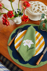Our Porto Placemat silhouette is back in a classic new palette! This set of two is crafted on a medium weight navy linen with handsome contrasting borders in green hand-stitched in appliqué. Pair with our matching